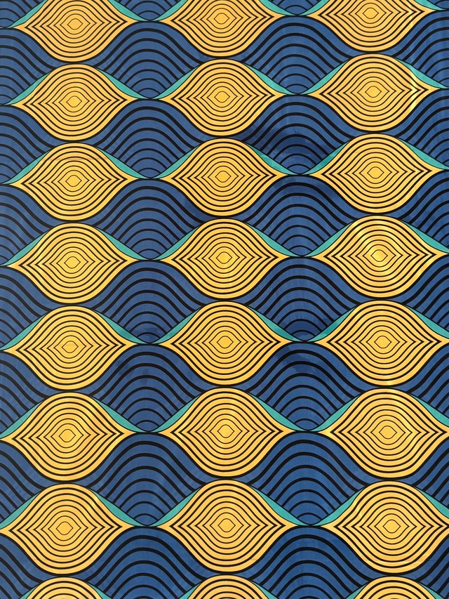 アフリカから直輸入した本物のアフリカンワックスプリントです。 鮮やかなイエローゴールドと深みのあるブルーが交互に波打つ、リズミカルで目を引くデザインです。同心円状の幾何学模様が立体感を生み出し、見る角度によって表情が変わる魅力的な一枚です。ターコイズのアクセントが全体を引き締めています。 BLACK PRINCEの最高級ライン**「Golden Java」**シリーズ。100%コットンの上質な生地に美しい発色が特徴です。 サイズ: 2ヤード(約182cm × 約120cm) 素材: 100% コットン こんな用途におすすめ: ワンピース・スカート・シャツなどの洋服 バッグ・ポーチなどの小物 テーブルクロス・クッションカバーなどのインテリア ハンドメイド素材 ------------------------------ 【ご購入前に必ずお読みください】 ------------------------------ ■ワックスプリントについて 本品は本場アフリカの伝統的なワックスプリント技法で製造されています。布の表面にワックス(蝋)が残っている場合がありますが、品質上の問題はございません。ご使用前に水洗いいただくことをおすすめします。 ■カット位置について 6ヤードの反物からカットしてお届けするため、お届けする柄の位置・切り出し箇所はお選びいただけません。同じ商品でも柄の出方が異なる場合がございます。予めご了承ください。 ■テープ跡・折り目について 直輸入品のため、流通過程で付いたテープ跡・折り目・軽度の汚れが残っている場合がございます。現地からの直輸入ならではの特性としてご理解いただけますと幸いです。 ■色移りについて 初回洗濯時は色落ちする場合がございます。必ず単独で洗濯し、他の衣類との色移りにご注意ください。また、濡れた状態で他の生地と長時間接触させないようご注意ください。 ■洗濯について ・初回は必ず単独で手洗いまたはネット使用の上、弱水流でお洗いください。 ・水温は30℃以下を推奨します。 ・乾燥機のご使用はお避けください。 ・直射日光での乾燥は色褪せの原因になりますので陰干しをおすすめします。 ■色味について 撮影環境・モニターの設定により、実際の色味と若干異なって見える場合がございます。 ■在庫について 直輸入品のため、在庫がなくなり次第販売終了となります。お早めにご検討ください。 ■複数購入の送料について 複数点ご購入の場合、送料が変わる場合がございます。 その際は別途メッセージにてご連絡させていただく場合がございます。予めご了承ください。