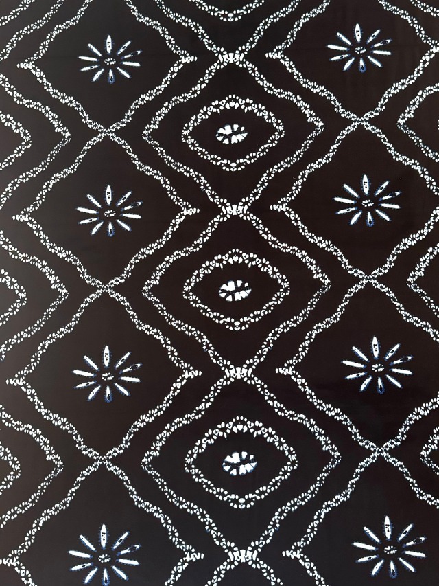 アフリカから直輸入した本物のアフリカンワックスプリントです。 深みのあるブラックの地に、白い粒点で描かれたダイヤ格子と小花が規則正しく広がる、凛とした美しさの一枚。伝統的な絞り染め(タイダイ)をモチーフにしたデザインで、手仕事のような温かみと、モノトーンならではのクールな存在感を兼ね備えています。シンプルながら近くで見るほど細かい表情が楽しめる、飽きのこない柄です。 DOGON WAXのブロックプリント技法で丁寧に仕上げた、100%コットンの上質な生地です。 サイズ: 1ヤード(約91cm × 約120cm) 素材:100% コットン こんな用途におすすめ: ワンピース・スカート・シャツなどの洋服 バッグ・ポーチなどの小物 テーブルクロス・クッションカバーなどのインテリア ハンドメイド素材 ---------------------------- 【ご購入前に必ずお読みください】 ---------------------------- ■ワックスプリントについて 本品は本場アフリカの伝統的なワックスプリント技法で製造されています。布の表面にワックス(蝋)が残っている場合がありますが、品質上の問題はございません。ご使用前に水洗いいただくことをおすすめします。 ■カット位置について 6ヤードの反物からカットしてお届けするため、お届けする柄の位置・切り出し箇所はお選びいただけません。同じ商品でも柄の出方が異なる場合がございます。予めご了承ください。 ■テープ跡・折り目について 直輸入品のため、流通過程で付いたテープ跡・折り目・軽度の汚れが残っている場合がございます。現地からの直輸入ならではの特性としてご理解いただけますと幸いです。 ■色移りについて 初回洗濯時は色落ちする場合がございます。必ず単独で洗濯し、他の衣類との色移りにご注意ください。また、濡れた状態で他の生地と長時間接触させないようご注意ください。 ■洗濯について ・初回は必ず単独で手洗いまたはネット使用の上、弱水流でお洗いください。 ・水温は30℃以下を推奨します。 ・乾燥機のご使用はお避けください。 ・直射日光での乾燥は色褪せの原因になりますので陰干しをおすすめします。 ■色味について 撮影環境・モニターの設定により、実際の色味と若干異なって見える場合がございます。 ■在庫について 直輸入品のため、在庫がなくなり次第販売終了となります。お早めにご検討ください。 ■複数購入の送料について 複数点ご購入の場合、送料が変わる場合がございます。その際は別途メッセージにてご連絡させていただく場合がございます。予めご了承ください。