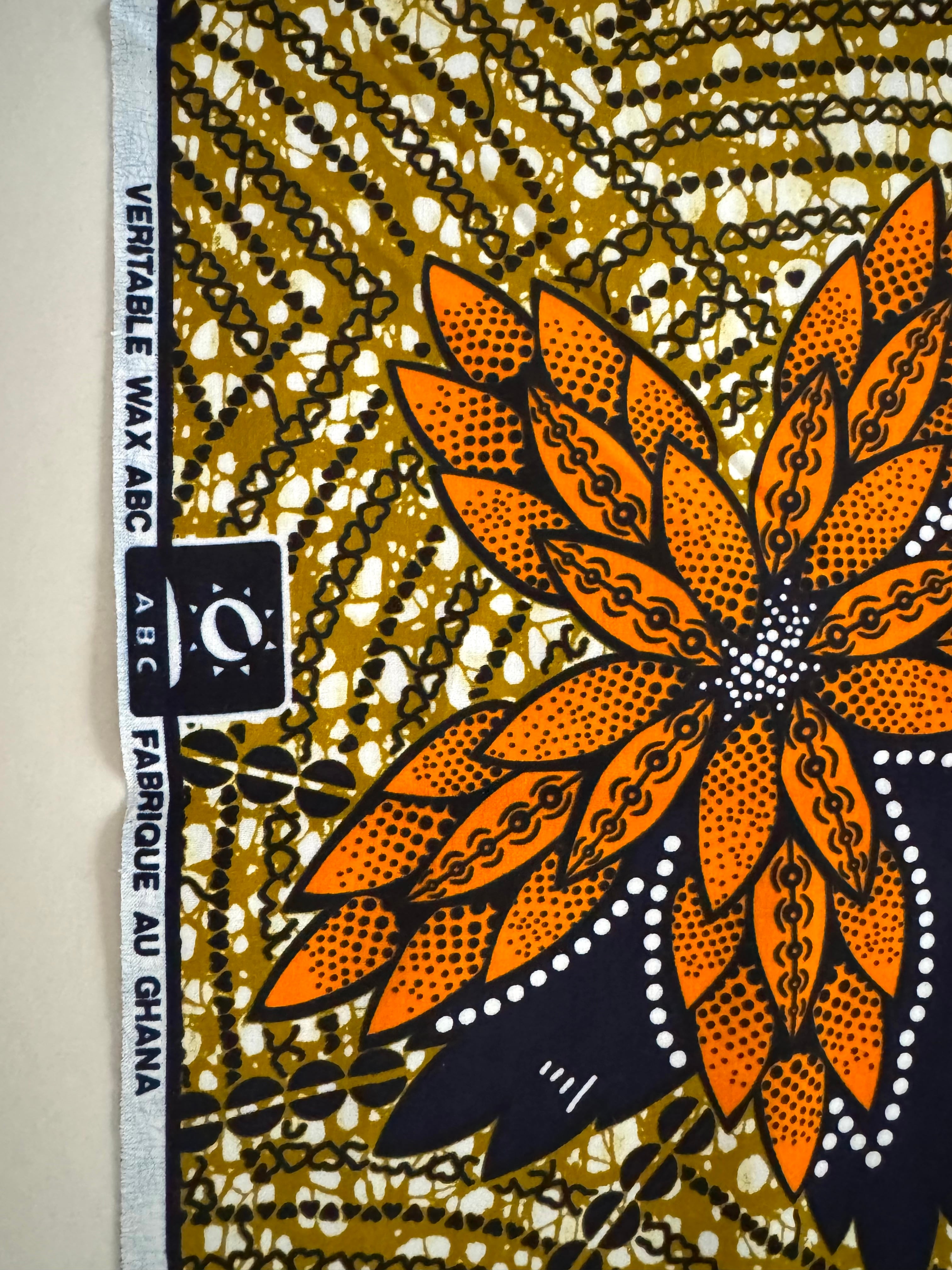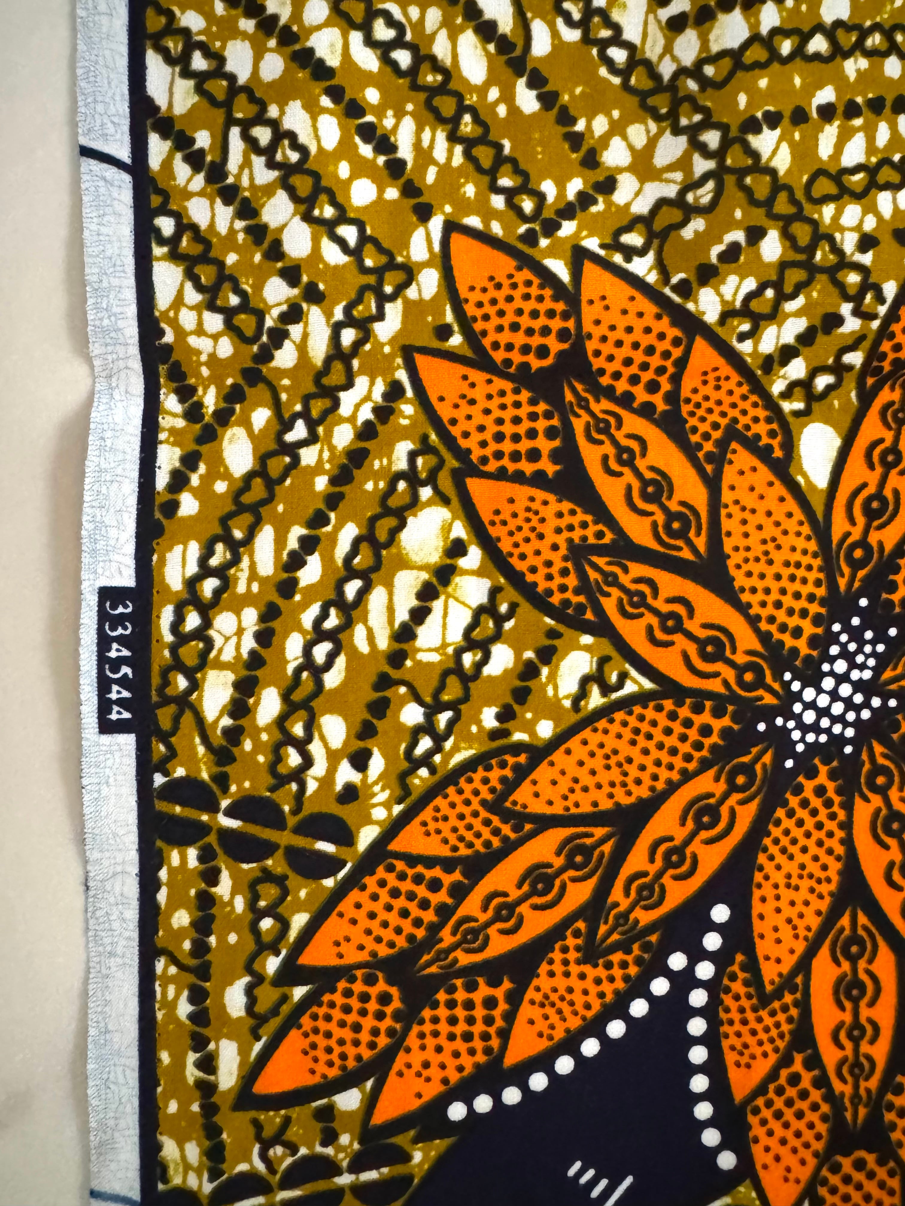 カーキゴールドの背景に、オレンジと黒の大輪の花が力強く咲き誇る華やかな一枚です。花びらの細かい模様と白いドット使いが上品さを加え、アフリカ布の中でも特に存在感のあるデザインです。