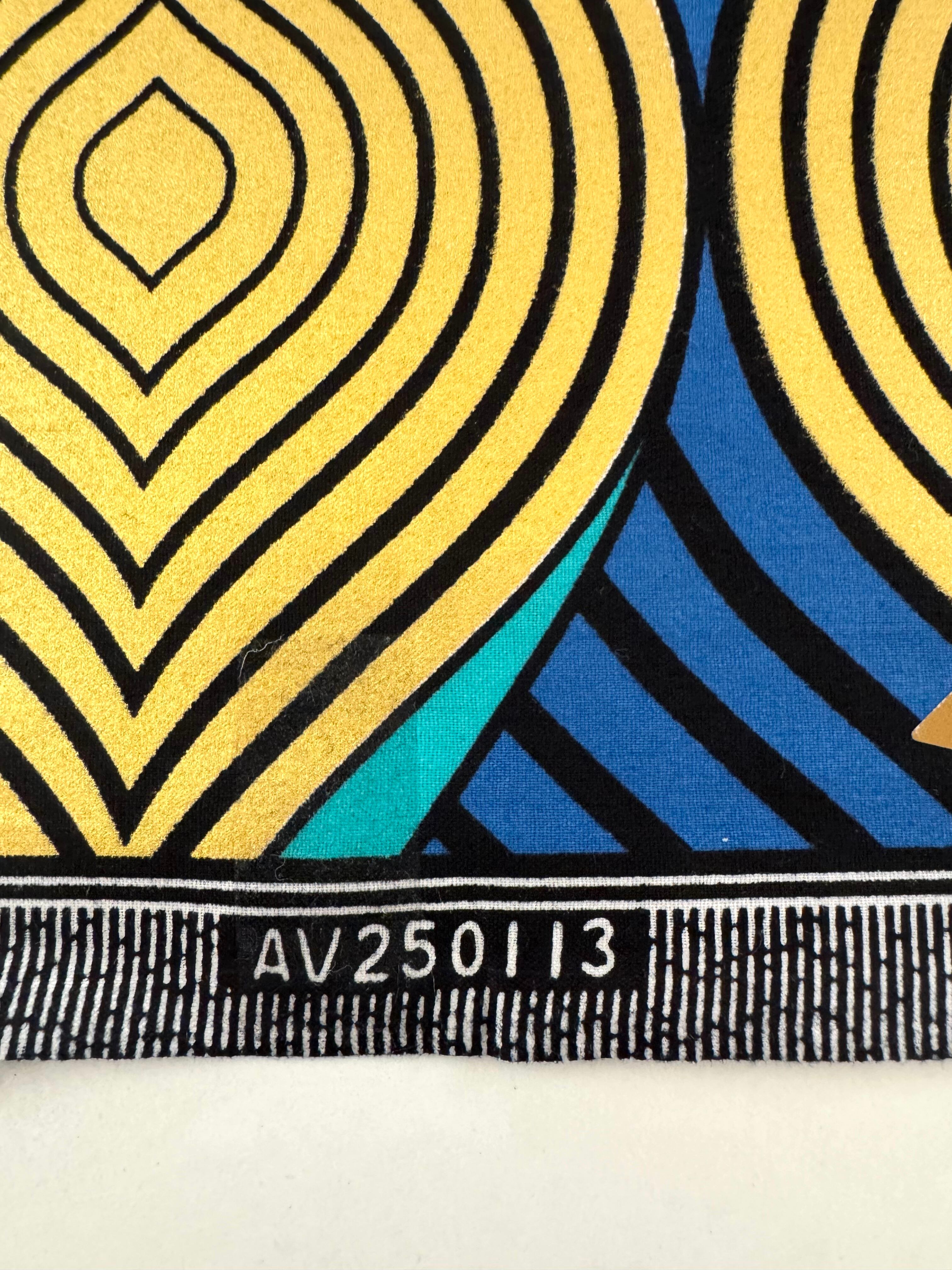 鮮やかなイエローゴールドと深みのあるブルーが交互に波打つ、リズミカルで目を引くデザインです。同心円状の幾何学模様が立体感を生み出し、見る角度によって表情が変わる魅力的な一枚です。ターコイズのアクセントが全体を引き締めています。