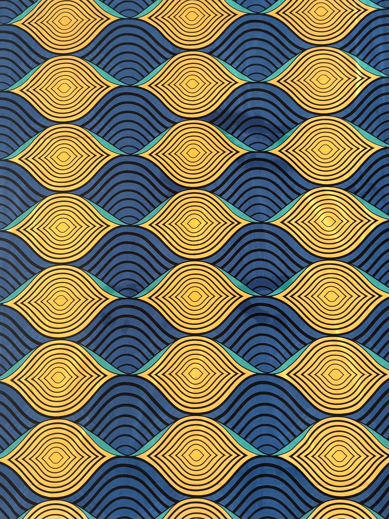 鮮やかなイエローゴールドと深みのあるブルーが交互に波打つ、リズミカルで目を引くデザインです。同心円状の幾何学模様が立体感を生み出し、見る角度によって表情が変わる魅力的な一枚です。ターコイズのアクセントが全体を引き締めています。